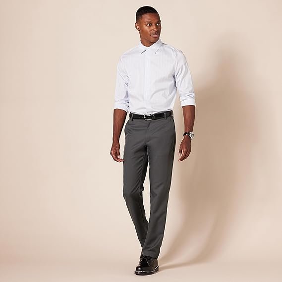 | SLIM FIT: Fitted through hip and thigh, with tapered leg. Sits below the waist. SUITING FABRIC: Cut from a sleek polyester twill suiting material with a subtle refined sheen for a tailored or business casual look all year round. Offered in conventional or recycled polyester fabric. BUSINESS CASUAL: These flat-front dress pants can be worn with a dress shirt or paired with a blazer. DETAILS: Features a zip fly with button-front closure, front slant pockets and button-through back pockets. Interior curtain waistband for a tailored look. LEG OPENING: 7 3/4" on US size 33 |