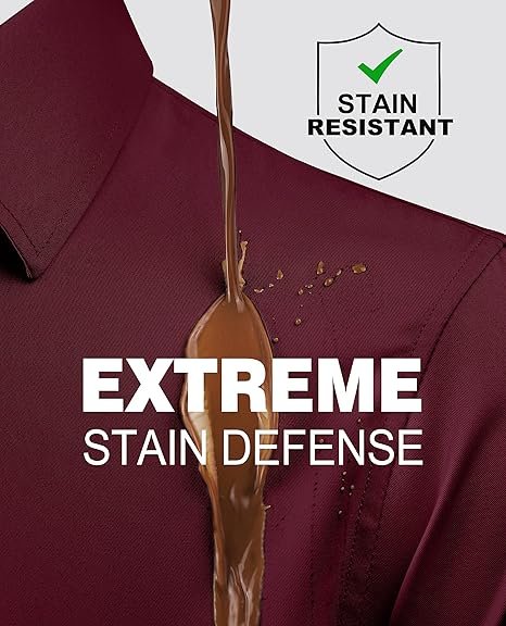 Stain Proof Mens Dress Shirts: Designed with Stain Shield technology material that blocks tough stains/most Oil-based spills before they start and makes to have stains literally roll off the dress shirts long sleeve, and keep clean and elegant all time